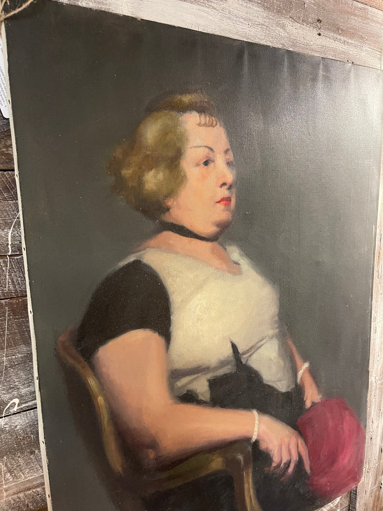 Her pearls and the neatly kept pasture behind her suggest adherence to tradition, yet the glint in her eyes and the subtle curve of her mouth reveal a spirited personality beneath her composed exterior. Painted with a restrained palette against a dark background, the work draws the viewer’s attention to a single accent of rich velvet at her collar—a touch of softness in an otherwise formal composition. Local accounts describe her as a woman who managed the family farm with quiet authority while maintaining a sharp wit and lively sense of humor, often surprising visitors with her keen observations.