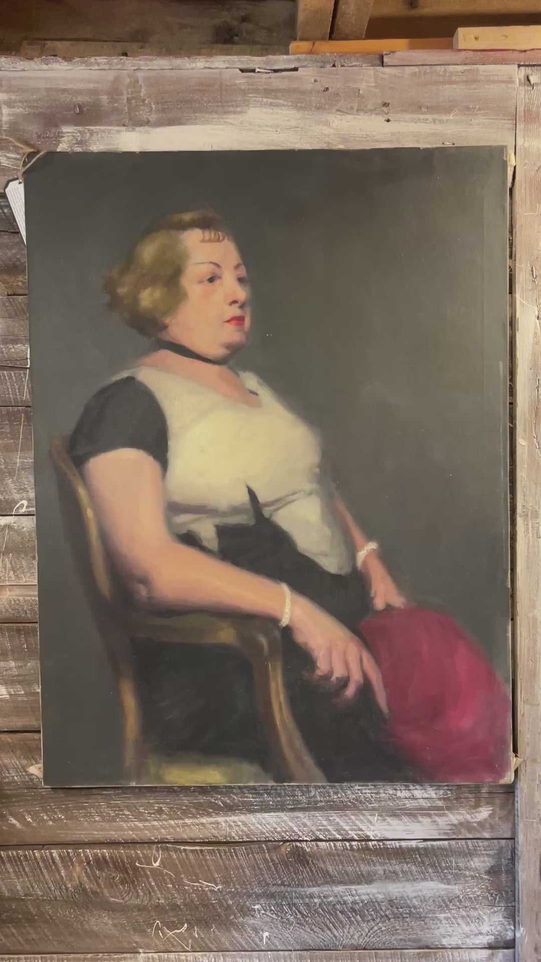 Her pearls and the neatly kept pasture behind her suggest adherence to tradition, yet the glint in her eyes and the subtle curve of her mouth reveal a spirited personality beneath her composed exterior. Painted with a restrained palette against a dark background, the work draws the viewer’s attention to a single accent of rich velvet at her collar—a touch of softness in an otherwise formal composition. Local accounts describe her as a woman who managed the family farm with quiet authority while maintaining a sharp wit and lively sense of humor, often surprising visitors with her keen observations.