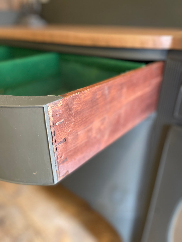 A refinished solid wood top and a removable backsplash complete the piece, adding to its adaptability and charm. Likely crafted from solid mahogany, it boasts dovetail and joinery throughout — a testament to enduring quality and American tradition.
