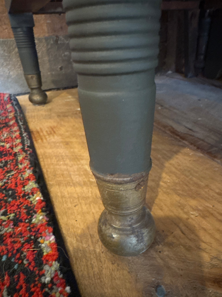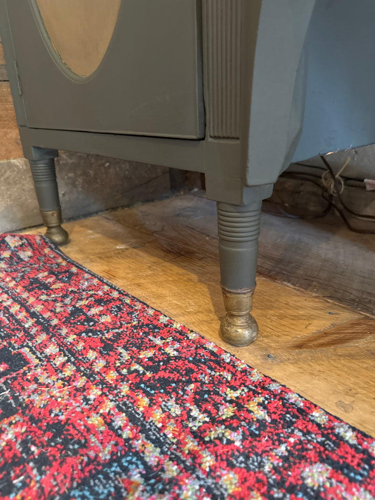 Refinished in our signature charcoal gray, a shade that is elegantly black with a brown undertone, this piece offers a grounded, sophisticated presence. A hand-stenciled taupe motif runs accents the front, thoughtfully echoing the warm undertones of the brass pulls and keyholes.