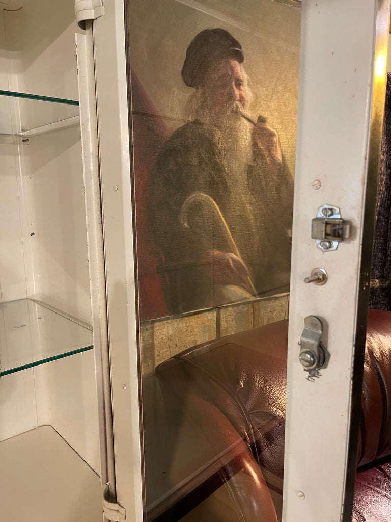 The upper portion features two glass doors with a working lock mechanism (key not included but can easily be reproduced) and two adjustable glass shelves — perfect for displaying glassware, books, collectibles, or bathroom linens. An interior light is wired to turn on and off automatically as the right door opens and closes, enhancing the display.